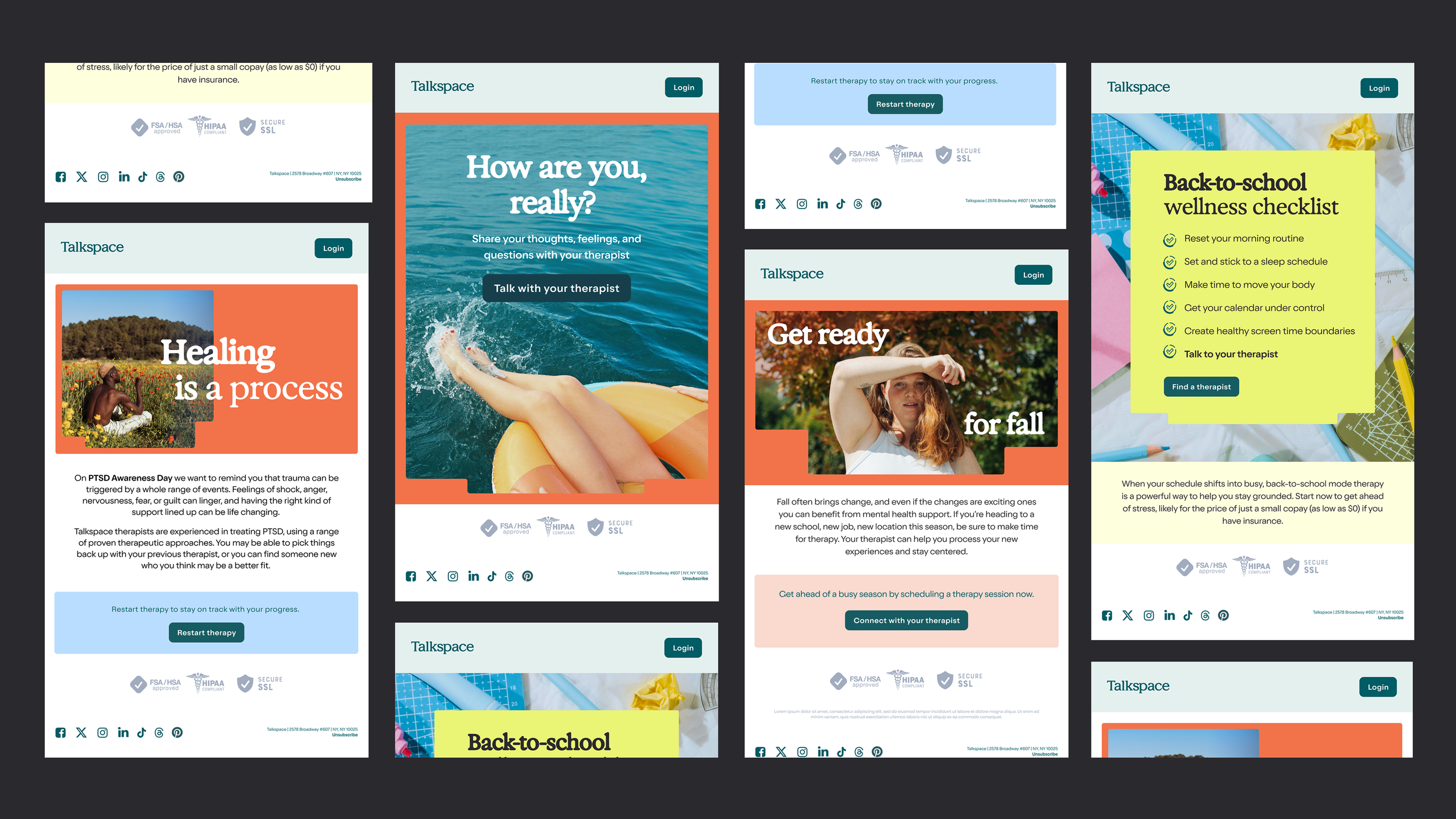 Talkspace is a mental health care service that exists to make therapy affordable and accessible. The following was created during my time at Talkspace under the leadership of Anna Fuentes as Art Director. The projects worked on included emails, organic social media, digital flyers, display ads, and worksheets. All creative works adhered to brand guidelines while continuing to innovate.